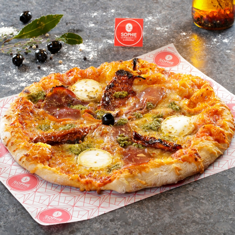 Réf. : 1387Base tomate, origan, olive noire, Jambon Serrano, Tomates séchées, Chèvre en tranches, Pesto, emmental, mozza
