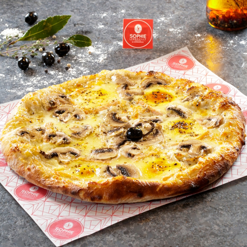 Réf. : 879Base crème, emmental, mozza, champignons frais, maroilles, origan, olive