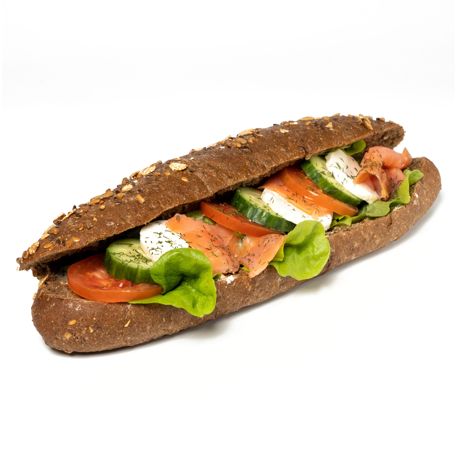 Réf. : 1425Pain Nordik, salade, crème cheese, saumon fumé, chèvre, tomate, concombre, aneth.