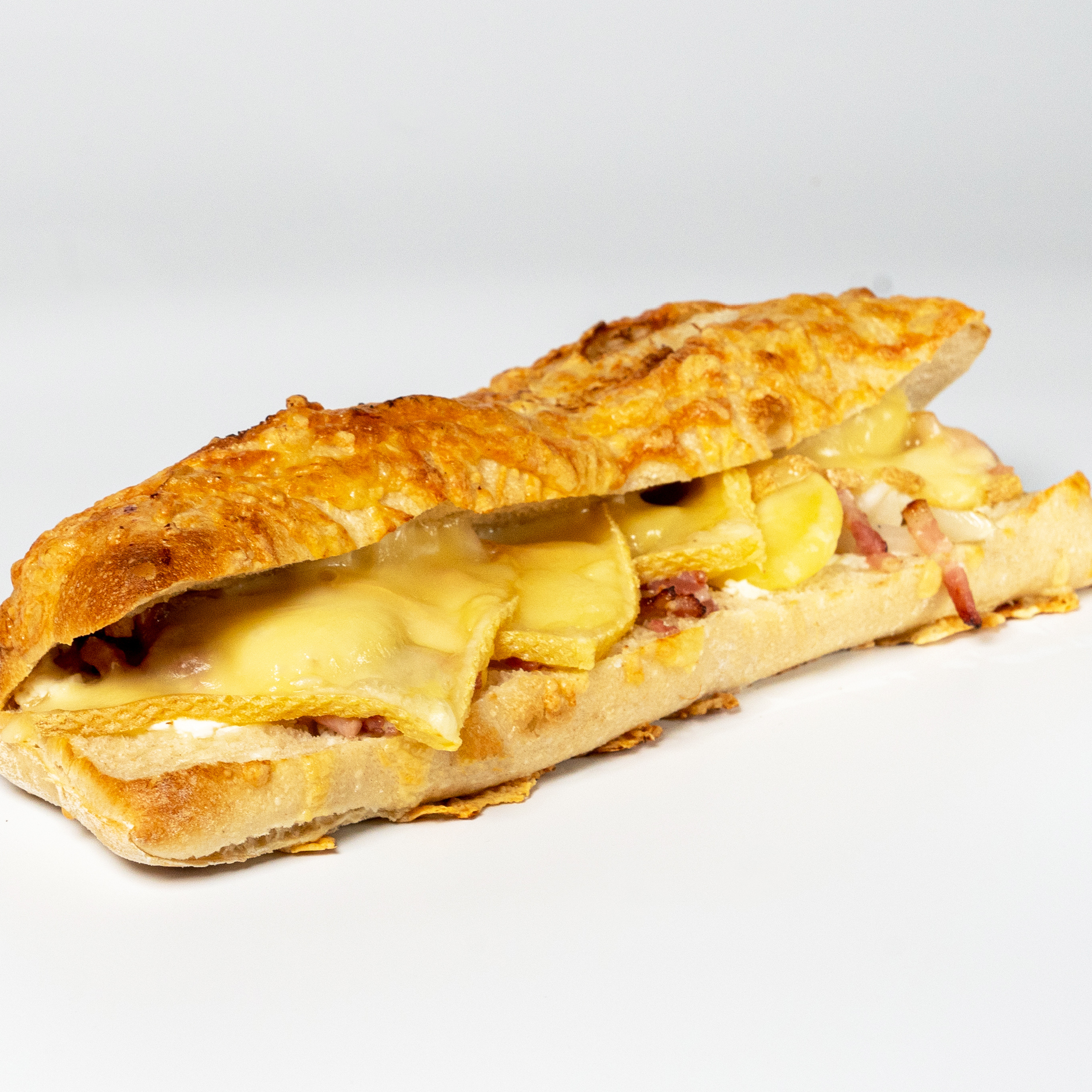 Réf. : 9964Pain sandwich recouvert de fromage gratiné, St Môret, lardons, oignons, pommes de terre rissolées, fromage à raclette.