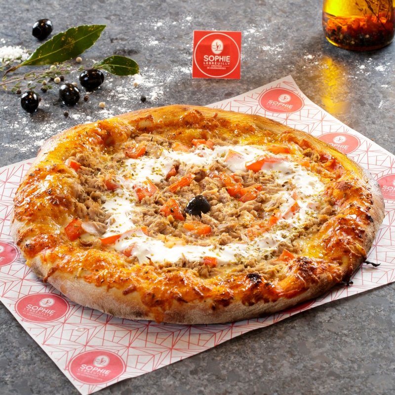 Réf. : 1449Base tomate, olive noire, miette de thon, tomate fraiche, origan, crème liquide, emmental et mozzarela